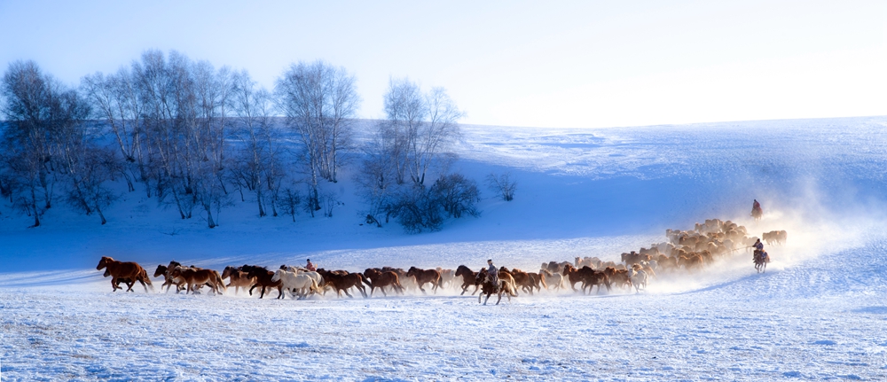 ウランブトン草原 馬が雪を踏んで走る