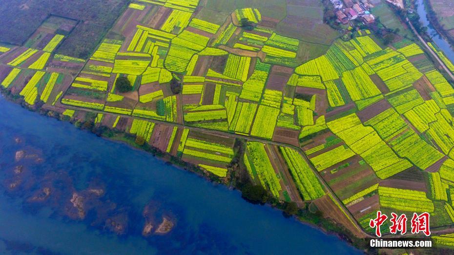 3月11日、空から撮影した江西省新余市劃江村。1000ムーの菜の花畑と東に流れる川が見える。黄金色の花畑は地形に沿って起伏し、村落、大樹、川に引き立てられ、パレットのようである。江南地方の田舎の雰囲気があるこの花畑は、市民のピクニックスポットになっている。