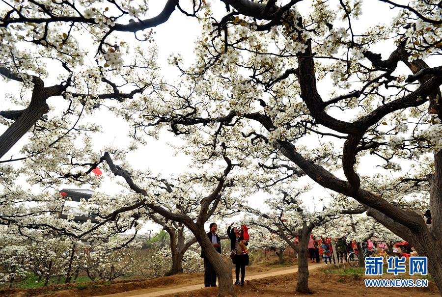 4月6日、河北省滄州市粛寧県尹荘村の梨園で梨の花を観賞する観光客