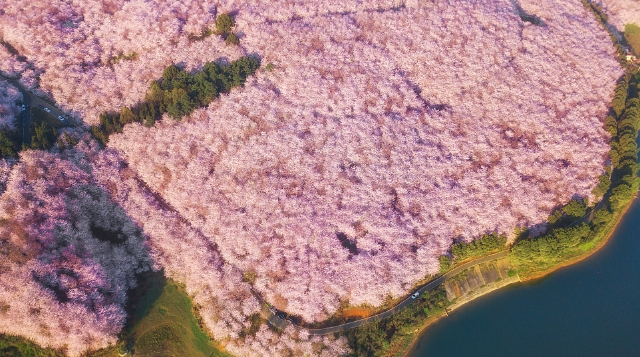 貴陽市平壩桜花園を空撮 一面のピンクが少女心をくすぐる