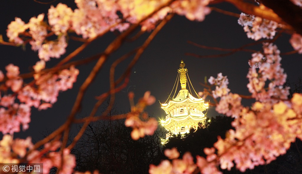 3月25日晩、南京市鶏鳴寺路の両側に咲く桜は闇に引き立てられてよりロマンチックになり、多くの花見客を引きつけた。
