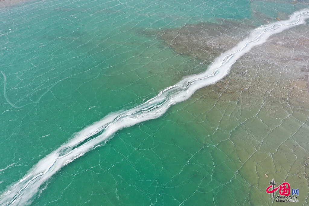 新疆ウイグル自治区バインゴリン・モンゴル自治州尉犁県にある羅布湖が凍りつき、湖面がエメラルドグリーンになった。タクラマカン砂漠の黄色い砂と「翡翠」が趣きを引き立て合い、絵に描いたような風景となった。