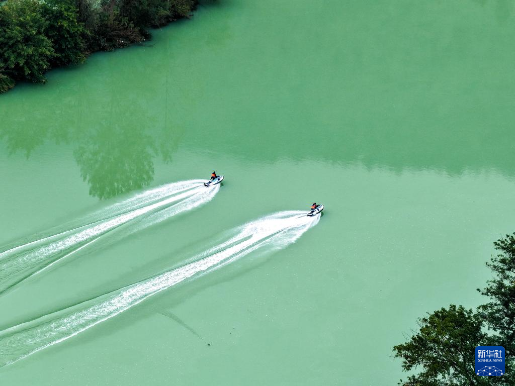 10月30日、濯水古鎮の阿蓬江でジェットスキーを体験するウォータースポーツ愛好家(ドローン写真)