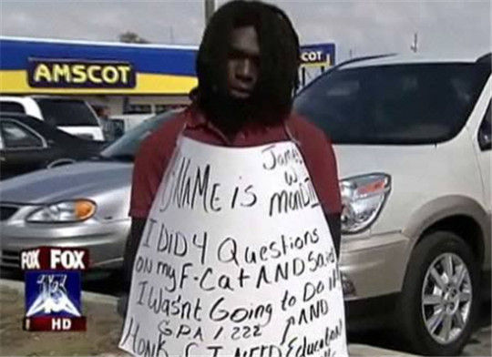 15歳の息子の成績が悪いことを理由に、フロリダ州のある母親は息子に各科目の成績を書いたカードを持たせ繁華街を歩かせた。この母親は、自分と夫は高校を卒業していないため、息子に同じようになって欲しくないとしている。