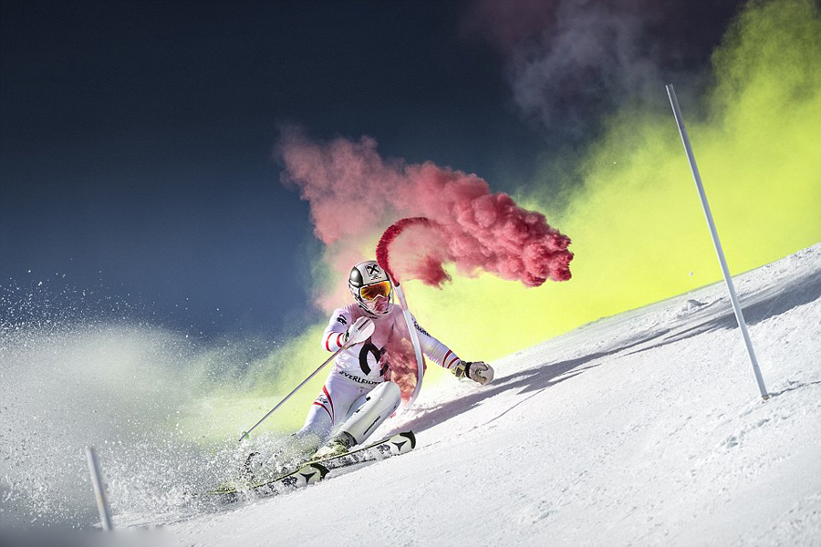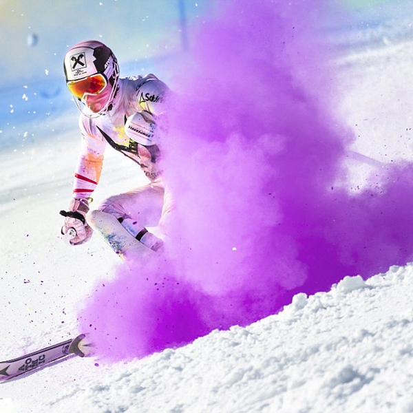 イギリスの『デイリー・メール』の4月8日の報道によると、オーストラリーアのスキー優勝者のマルセル・ヒルシャーはこのほど、美しいエキストリームスキーのパフォーマンスを行なった。ヒルシャーは滑りながらコースにカラーパウダーを撒き、白いコースにカラフルな雪が舞う様子は壮観である。