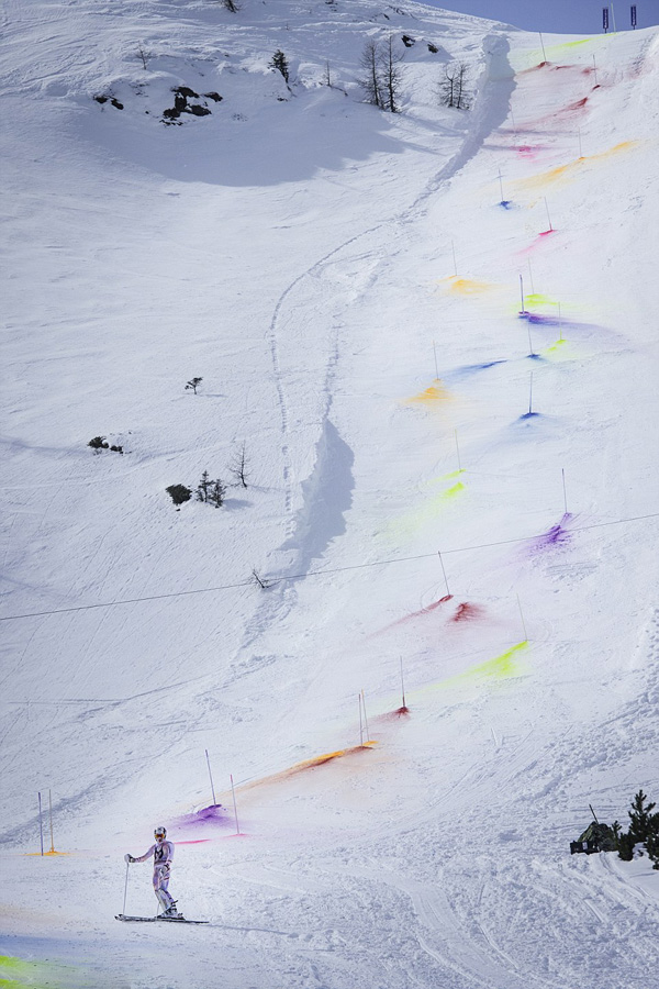 豪スキーヤー、エキストリームスキーで美しい虹を描く