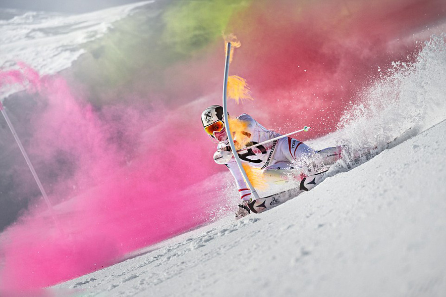 豪スキーヤー、エキストリームスキーで美しい虹を描く