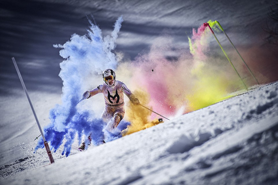 豪スキーヤー、エキストリームスキーで美しい虹を描く