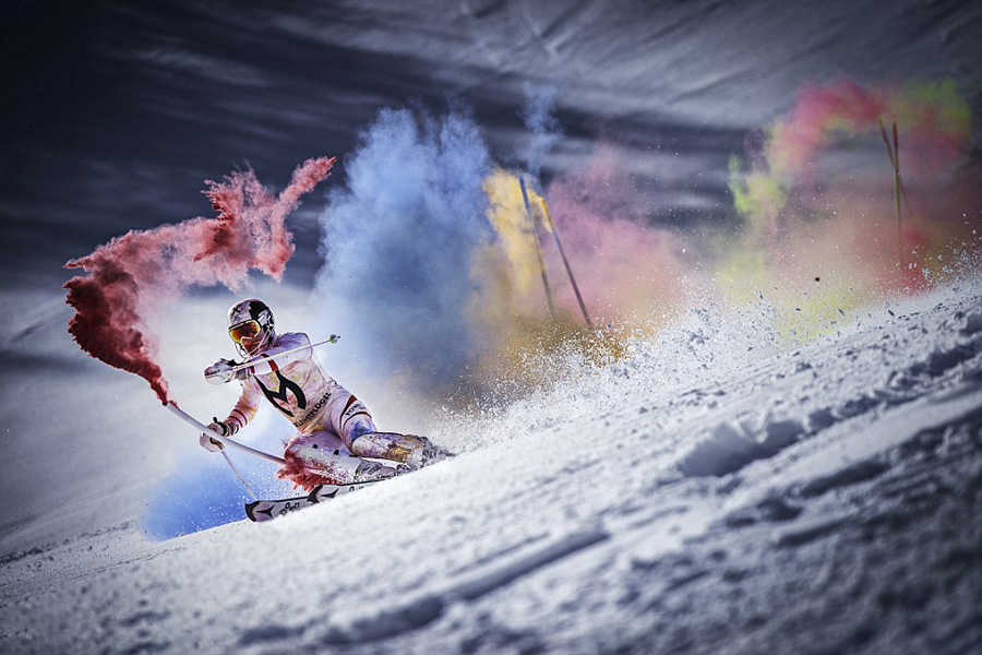 豪スキーヤー、エキストリームスキーで美しい虹を描く