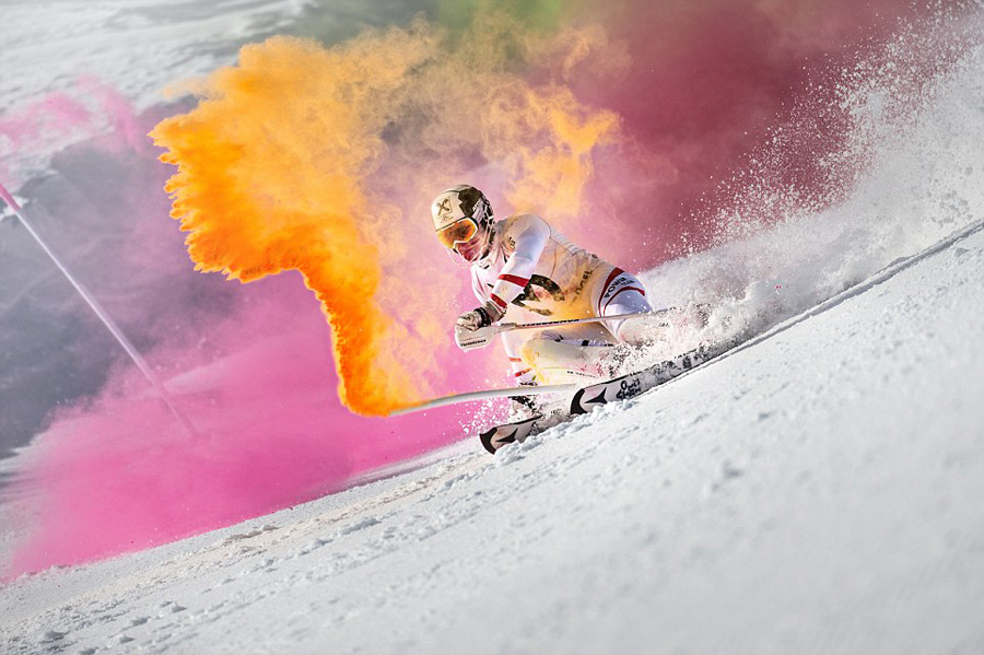 豪スキーヤー、エキストリームスキーで美しい虹を描く