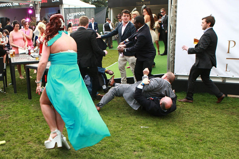 英「女性の日」 酒に酔った女性たち。 イギリス・リヴァプールにあるエイントリー競馬場で4月10日、障害競走・グランドナショナルが行なわれ、大会前日の「女性の日」には多くの女性が盛装して参加した…
