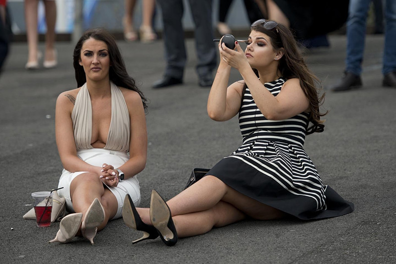 英「女性の日」 酒に酔った女性たち。 イギリス・リヴァプールにあるエイントリー競馬場で4月10日、障害競走・グランドナショナルが行なわれ、大会前日の「女性の日」には多くの女性が盛装して参加した…