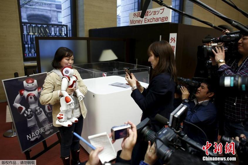 日本の銀行、接客ロボットを導入。 4月13日、日本の東京にある銀行で、ロボットの「NAO」は接客を行い、客の問い合わせに答えた…
