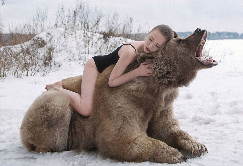 露モデルが雪の中でクマを抱く 狩猟反対を訴える