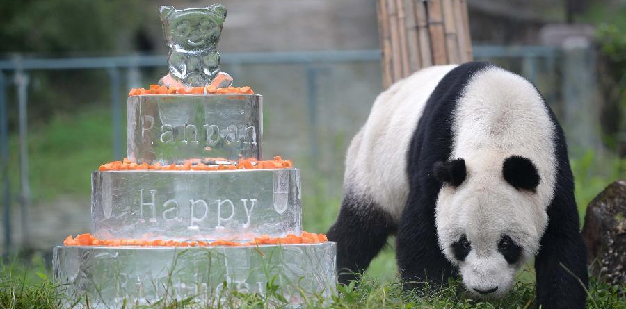 中国パンダ保護研究センターの職員は四川省都江堰市で9月21日、生存する世界最高齢のオスのパンダ「盼盼(パンパン)」の誕生日パーティーを行った…