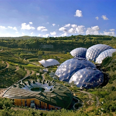 英のエデン・プロジェクト(建物群)はハイテクと未来技術を感じさせる8個のドームからなり、長さ240メートル、高さ55メートル、総面積2.2ヘクタールにも達する。太陽の下で耀く様は、石鹸のバブルがはじけているようにもみえる。