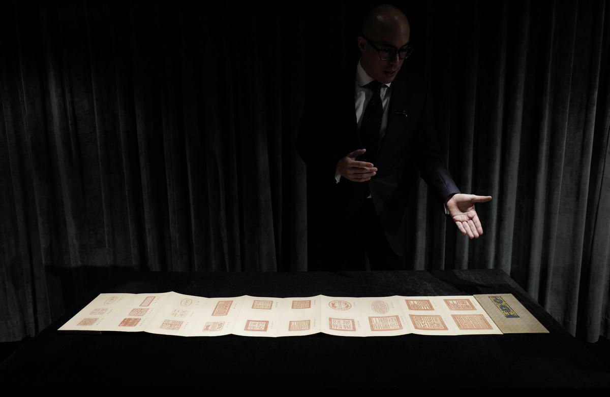 サザビーズ香港アジア地区副代表の仇国仕氏は3月14日、康熙帝の玉璽(皇帝印)「敬天勤民之宝」を公開した…