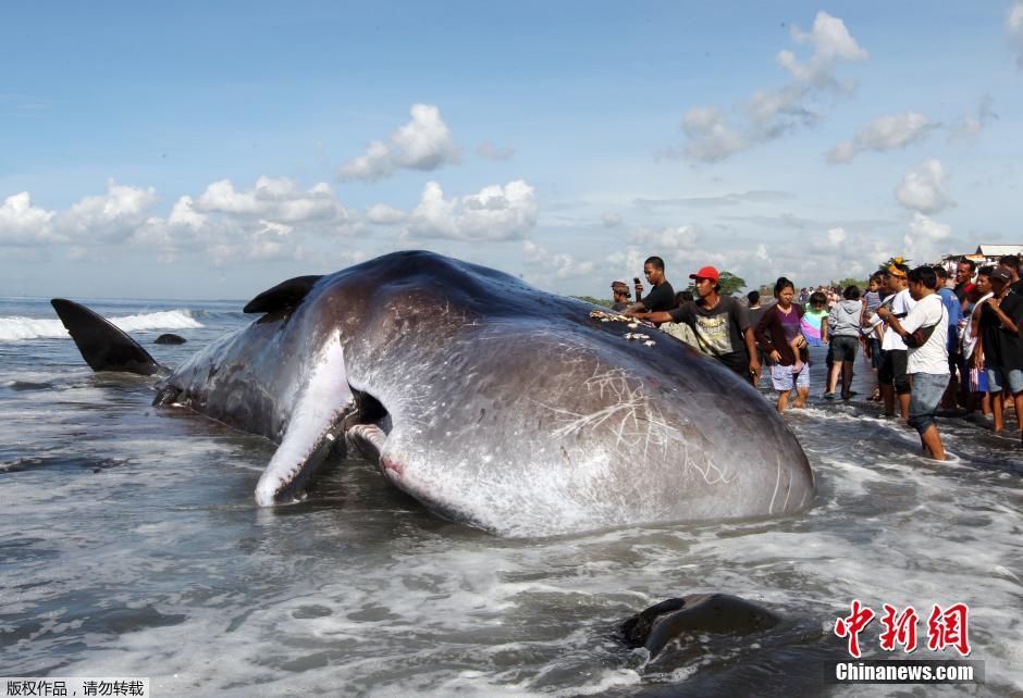 体長16.2メートルのマッコウクジラが3月14日、インドネシア・バリ島のクルンクン県のビーチに打ち上げられ、多くの地元住民が見物に訪れた…