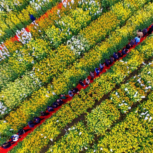3月15日、色鮮やかな菜の花を見るために並ぶ人たち。同日、四川省什ホウ市の皁角農科園にある60ムーあまりの「試験畑」で色とりどり菜の花が咲き始めた。赤と橙、赤と白、白、ピンクと白、黄と橙などの様々な色の菜の花で描かれた「観音頌春」や「仙女拝寿」などの絵は、各地から訪れた観光客を魅了した。