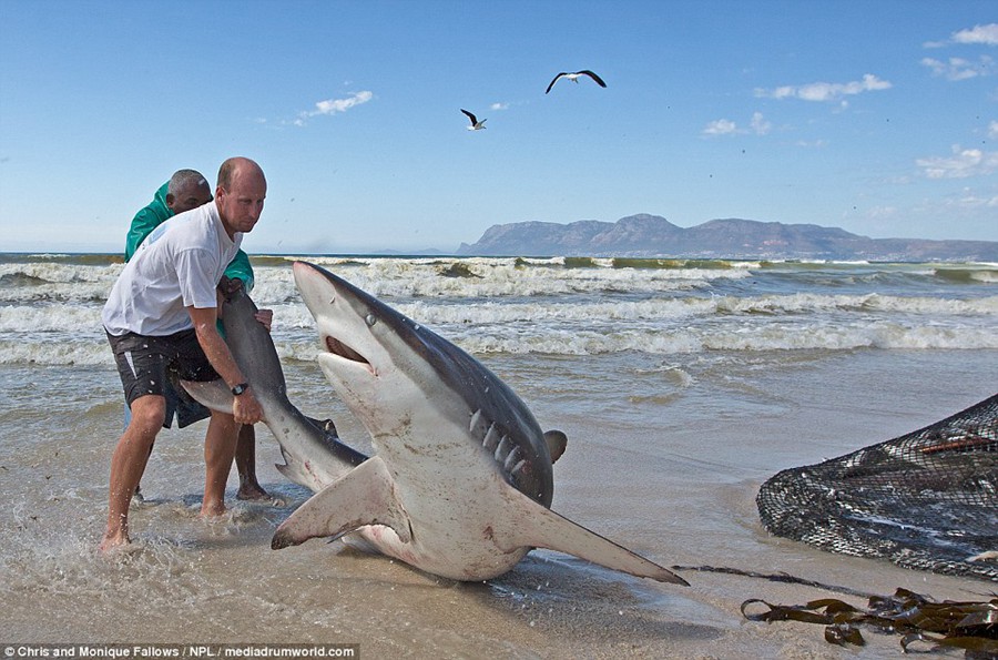 南アフリカ 漁師が網にかかった巨大サメを海に帰す
