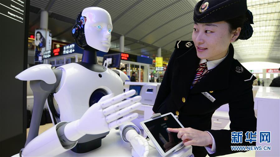 12月29日、済南西駅の待合室で、スマートロボットとの会話をデモンストレーションする職員