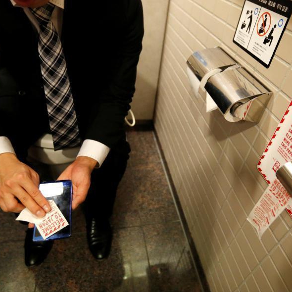 12月28日、成田空港のトイレに用意されている「スマホ専用トイレットペーパー」。日本のある通信会社はスマートフォンをきれいにするトイレットペーパーを設置し、トイレに入っている間にスマートフォンをきれいにできるようにした。