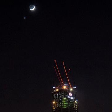 1月2日、内蒙古自治区フフホト市の空に輝く金星と月。旧暦12月5日、金星と月が大接近し、「金星と月の共演」が観測された。