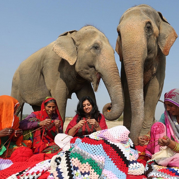 インドの動物保護団体・ワイルドライフSOSとマトゥラーにあるゾウ保護センター近くの村の女性たちが、ゾウが寒い夜に凍えないようにするために服を編んだ。