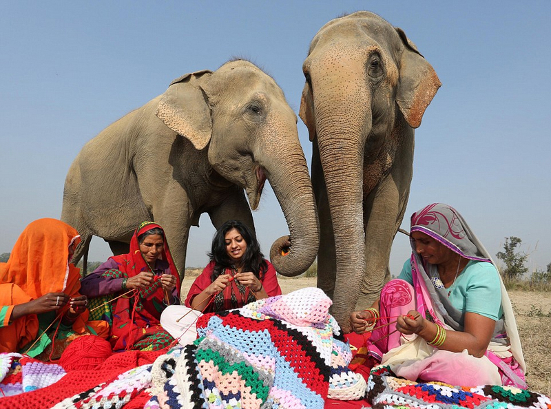 インドの動物保護団体・ワイルドライフSOSとマトゥラーにあるゾウ保護センター近くの村の女性たちが、ゾウが寒い夜に凍えないようにするために服を編んだ…