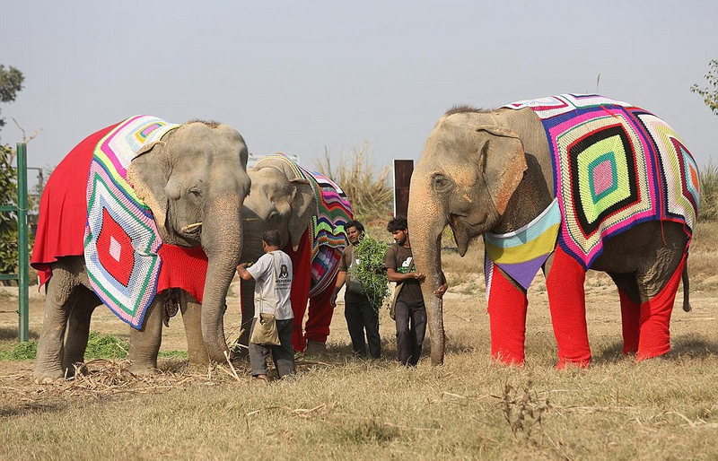 インドの動物保護団体・ワイルドライフSOSとマトゥラーにあるゾウ保護センター近くの村の女性たちが、ゾウが寒い夜に凍えないようにするために服を編んだ…