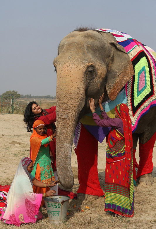 インドの動物保護団体・ワイルドライフSOSとマトゥラーにあるゾウ保護センター近くの村の女性たちが、ゾウが寒い夜に凍えないようにするために服を編んだ…