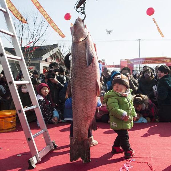 「漁獲フェア」の競りで21日、子供が自分よりも大きな巨大魚を目にした。江蘇省南通市海安県白甸鎮で同日、第6回となる冬季漁獲フェアが開催された。舞龍のショー、ミサゴの捕食、巨大魚の競り、水上綱引きなどのイベントが、1000人弱の観光客を集めた。
