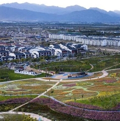 9月23日、ドローンで撮影した石嘴山市大武口区星海鎮沙湖古鎮の花畑。寧夏回族自治区石嘴山市大武口区星海鎮の星海湖畔でこのほど、90種以上の観賞花が咲いた。敷地面積300ムーに及ぶこの花畑はかつてアルカリ地とごみ捨て場だったが、生態修復により現在の姿になり、市民と観光客の新たな憩いの場になった。石嘴山市は近年、「緑水青山は金山銀山」という発展理念を堅持し、「生態立市」戦略を実施し、環境問題を改善し、生態修復に取り組んでいる。同市は賀蘭山一体化整備、沙湖星海湖水系接続、山水林田湖草生態修復などの重大な生態建設プロジェクトを実施し、石炭鉱業都市から青空・緑の大地、きれいな水がある「塞上江南」新都市への変化を遂げた。
