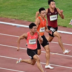 9月21日、ゴール後に優勝を喜ぶ広東チームの蘇炳添選手。蘇選手は9秒95の好タイムで優勝を決めた。同日、第14回全国運動会の陸上男子100メートルの決勝が西安奥体センターで行われた。