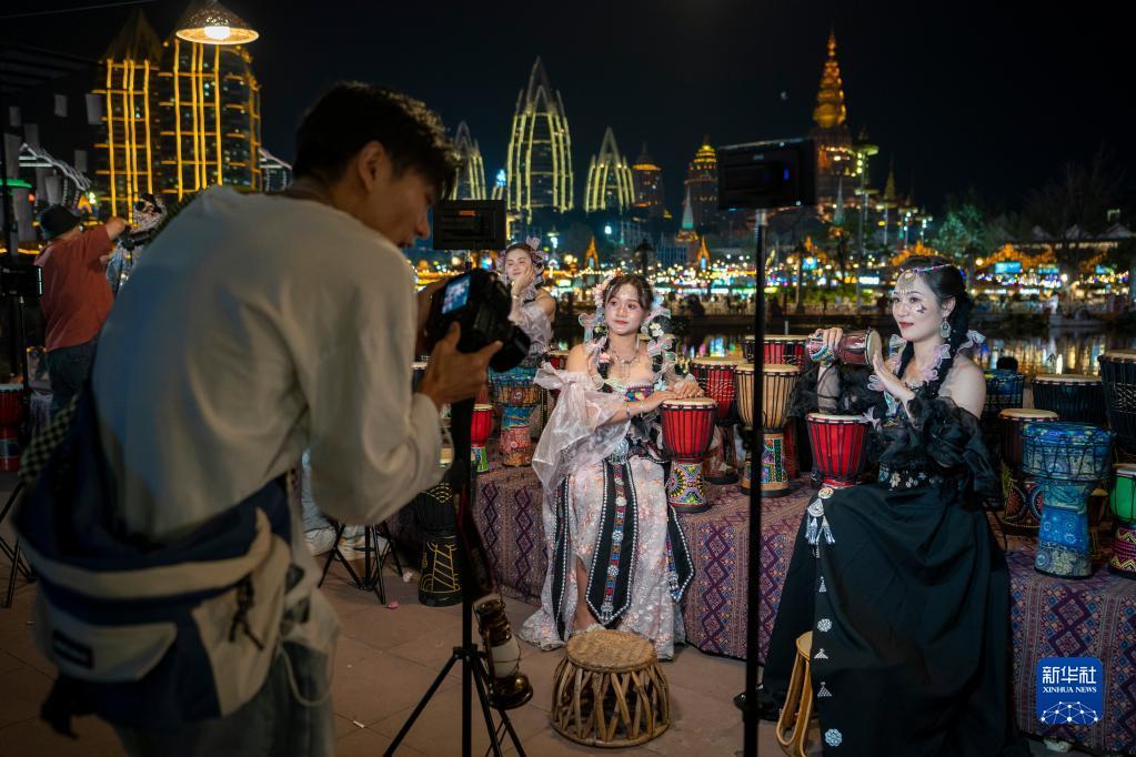夜になると、雲南省シーサンパンナ・タイ族自治州景洪市にある告荘西双景星光夜市は色とりどりの光に溢れ、大勢で賑わう。民族風情が感じられる旅行写真撮影は観光客に人気の体験項目となり、町の「夜経済」を活性化している。