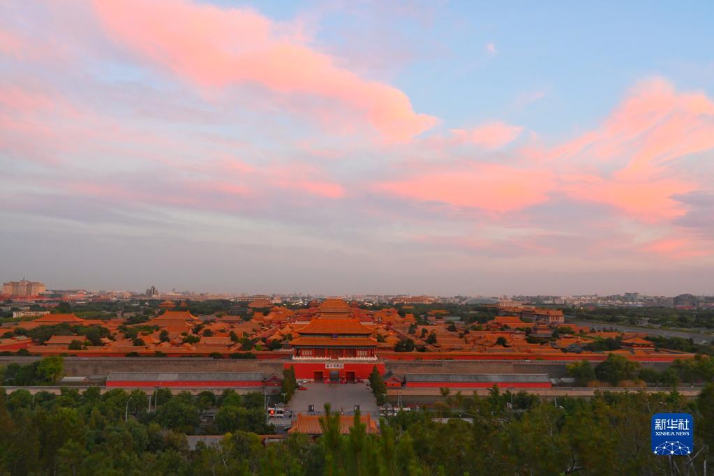 6月7日、夕焼けで引き立つ北京故宮博物院。同日の夕暮れ時、北京市に美しい夕焼けが現れ、空が赤く染まった。