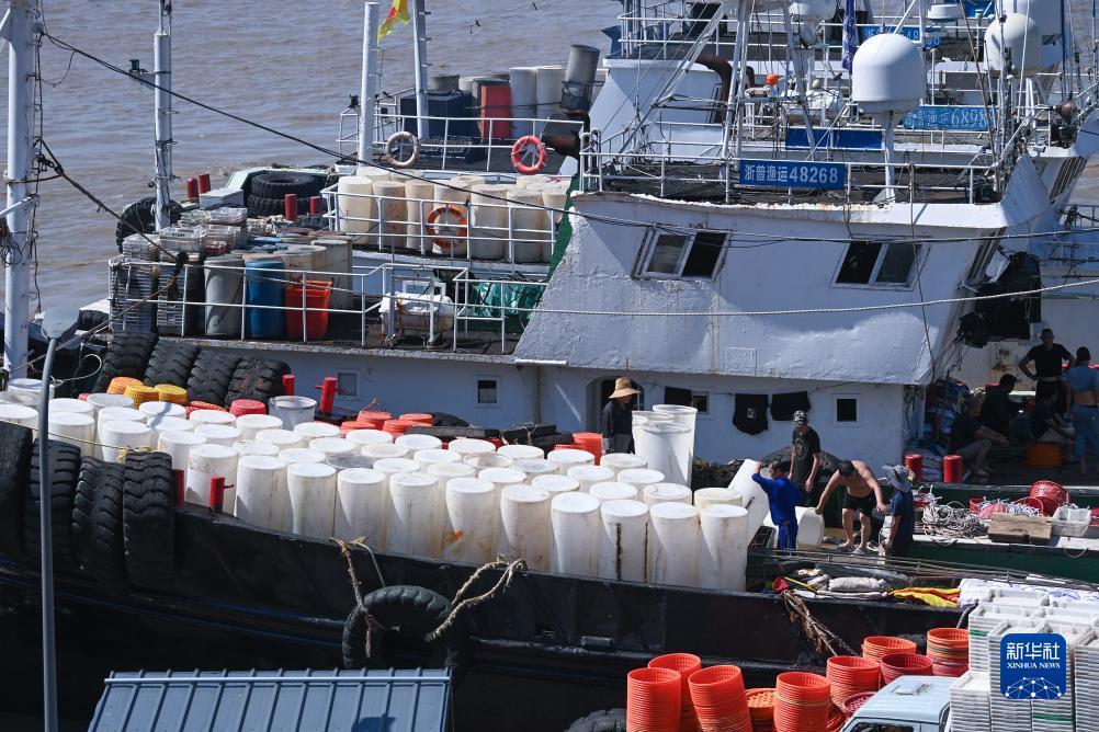 8月6日,停泊在舟山普陀沈家门渔港的渔船上的渔民们在为当天的开渔做准备工作。