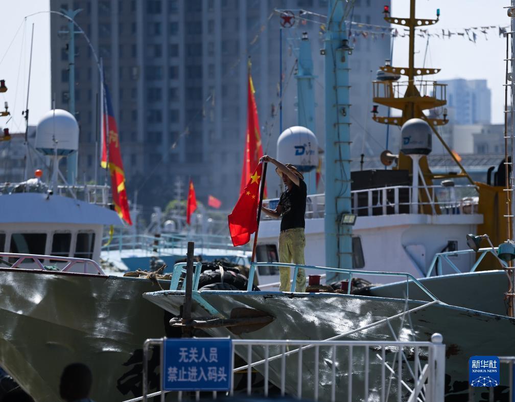 8月6日,停泊在舟山普陀沈家门渔港的渔船上的渔民们在为当天的开渔做准备工作。