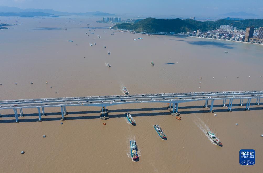 8月6日,渔船从舟山普陀沈家门渔港驶出,前往东海渔场(无人机照片)。