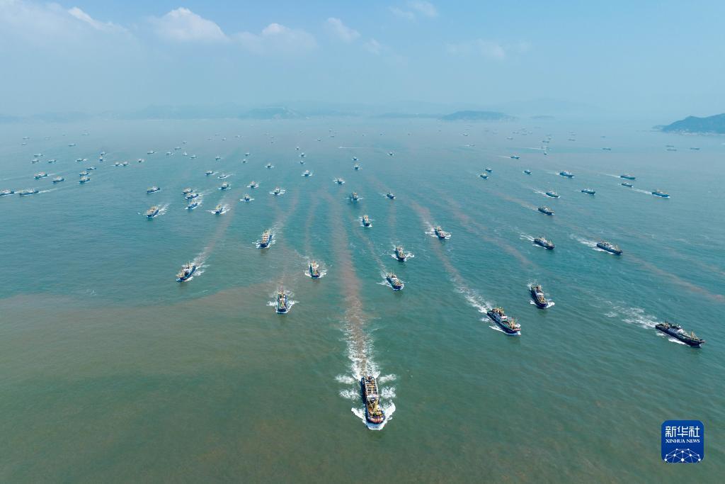 8月6日,浙江省温岭市渔船扬帆驶向东海(无人机照片)。