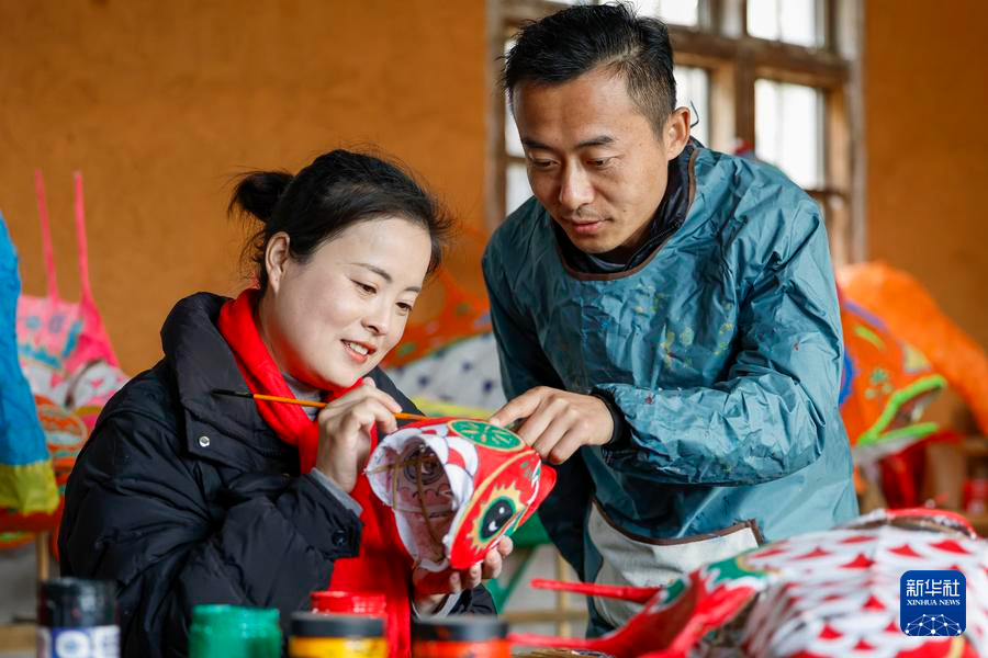 黄山市黟県宏村で生徒に花灯制作を指導する何継星さん(右)。(2024年12月9日撮影、黄山=新華社記者/傅天)