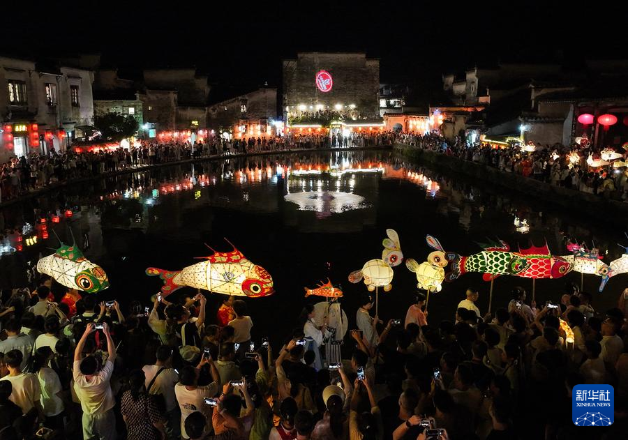 黄山市黟県宏村を巡る花灯パフォーマンス隊。(2024年9月15日、ドローンから、黄山=新華社配信/施亜磊)