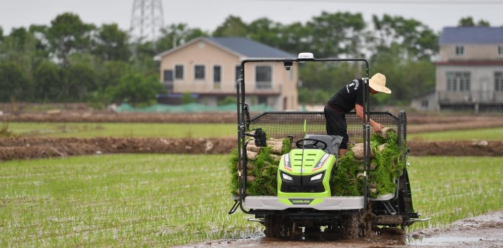 十数台の自動田植え機が4月23日、湖南省益陽市南県南洲鎮班嘴村の田んぼで作業した。これらの田植え機はルート設定やリアルタイムポジショニングなどの機能を有し、人は田植えをサポートするだけでよく、労働力を削減できると同時に、作業の規範化と効率化にもつながる。