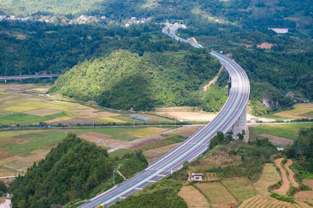 9月29日、山岳地帯を走る桑竜高速道路。(ドローンから、長沙=新華社記者/陳思汗)