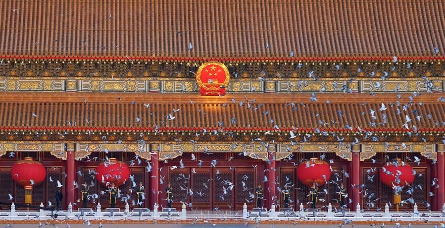 1日、国旗掲揚式の後に放たれた平和を象徴するハト。(北京=新華社記者/邢広利)